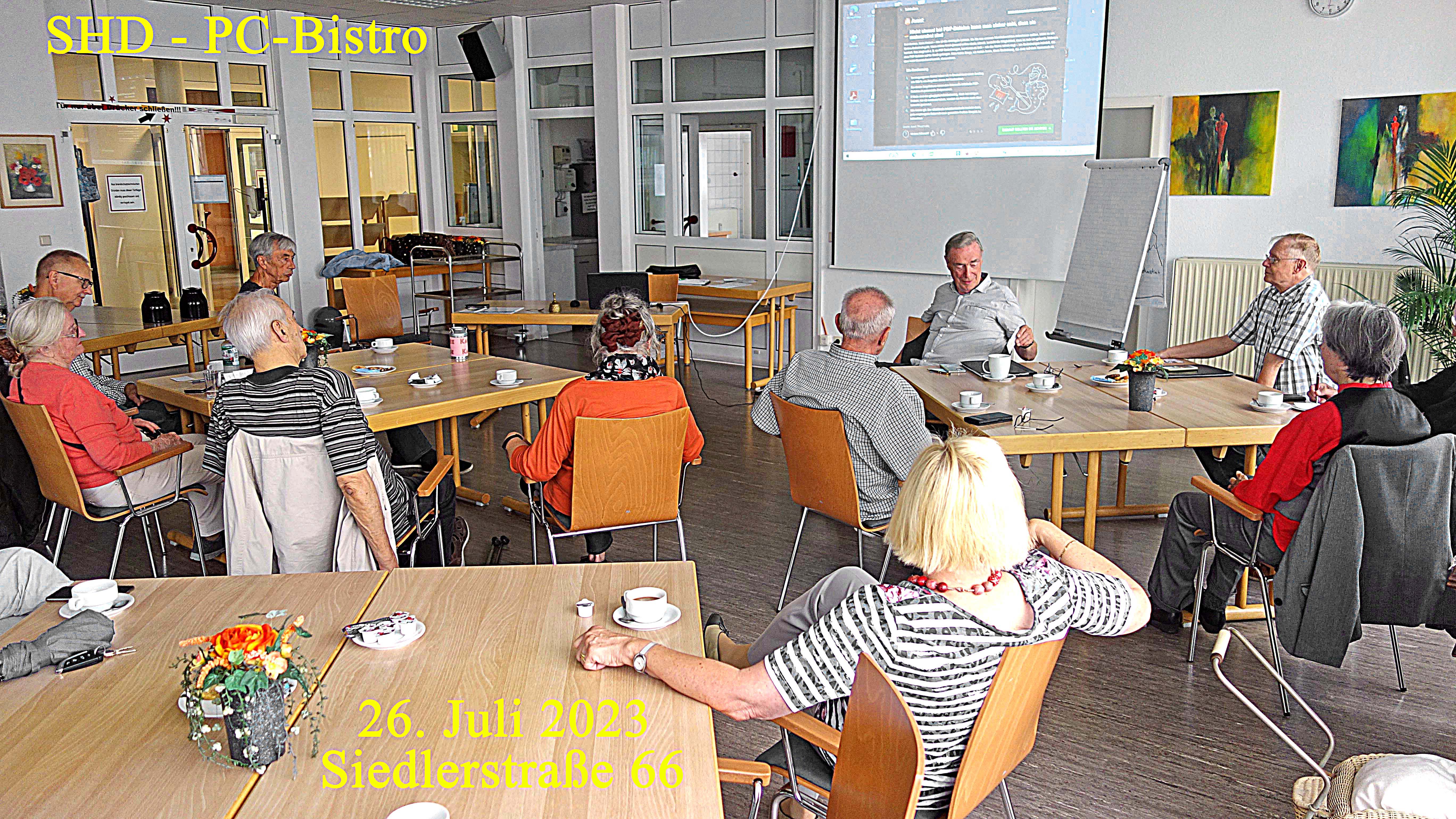 So hat auch die Gruppe „PC-Bistro“ im Juli zum ersten Mal in den neuen Räumen ihr monatliches Treffen mit 20 Teilnehmern - wie üblich bei Kaffee und Cookies - veranstaltet.